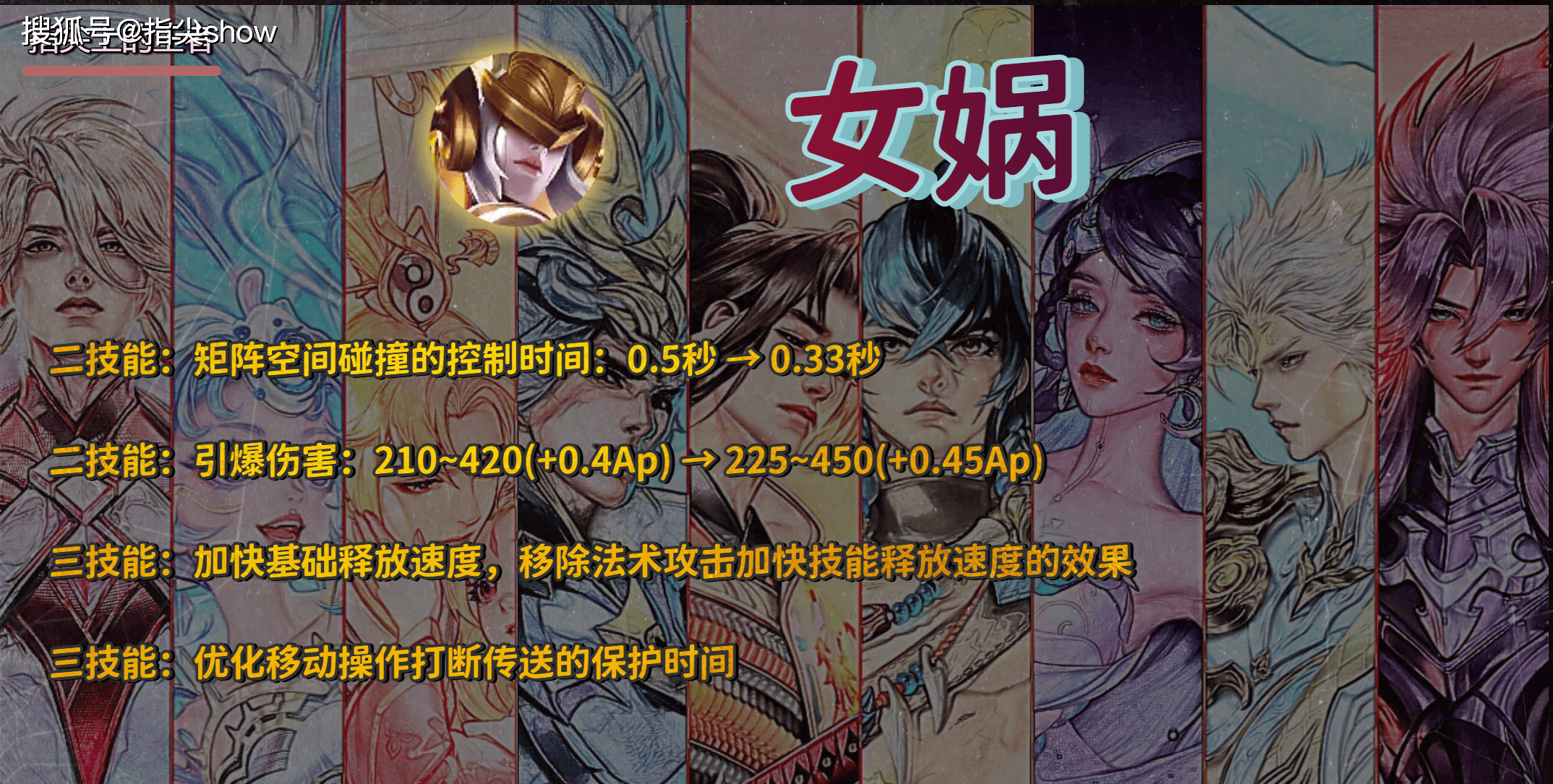本次调整我觉得偏削弱向,后期女娲的伤害爆炸,快速落地让敌人反应不及时而吃到1技能是很常规的玩法,但落地时间慢容易给敌人反应时机,追击时风险提升,而伤害换控制这件事,我觉得控制似乎更重要点。