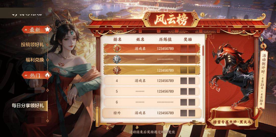 第1至3名少侠均可斩获坐骑-黑天马与专属称号,以绝世之礼加冕绝世之人;第4至30名少侠可解锁专属称号,定格此番冲榜的荣光时刻。无论位列几何,全力以赴者皆不负江湖之名。