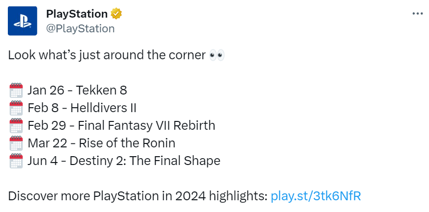 还有几天就到新年了,对于游戏玩家来说来说有什么可以期待的呢。今日PlayStation官方为玩家推荐了在2024年上半年值得游玩的PS5游戏,一起来看看。
