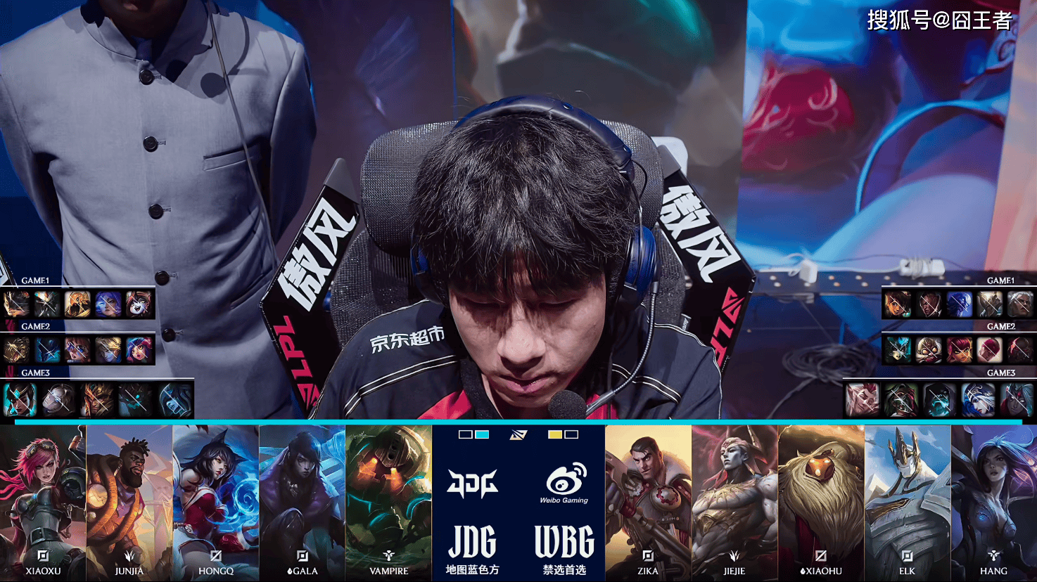 第一局比赛,WBG蓝色方,禁用:卡尔玛,梦魇,发条,蔚,冰鸟,选用:Zika狼母,Jiejie潘森,Xiaohu瑞兹,Elk卢锡安,Hang米利欧;JDG红色方,禁用:寒冰,韦鲁斯,皇子,娜美,巴德,选用:Xiaoxu兰博,Junjia蝎子,HongQ沙皇,GALA芸阿娜,Vampire璐璐