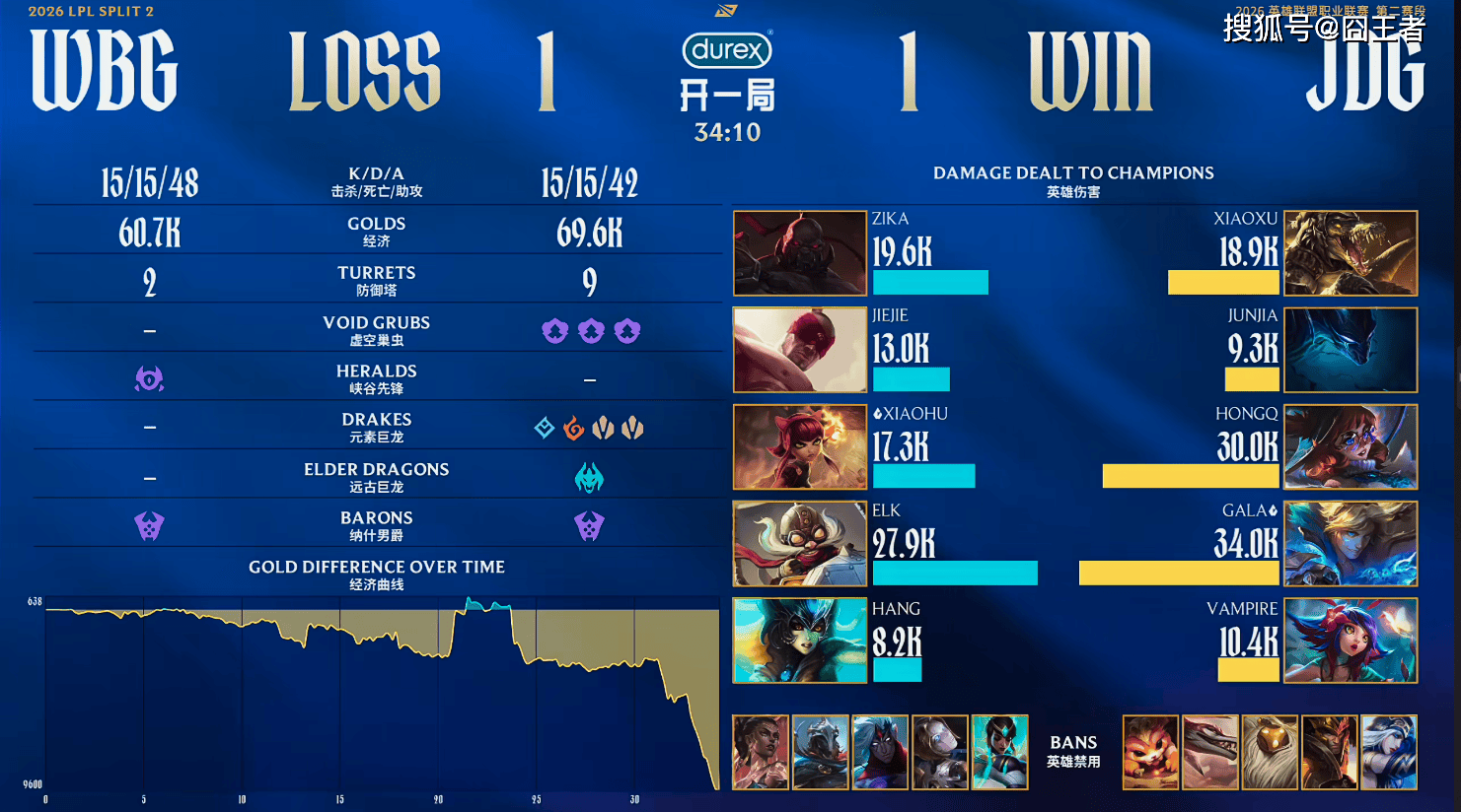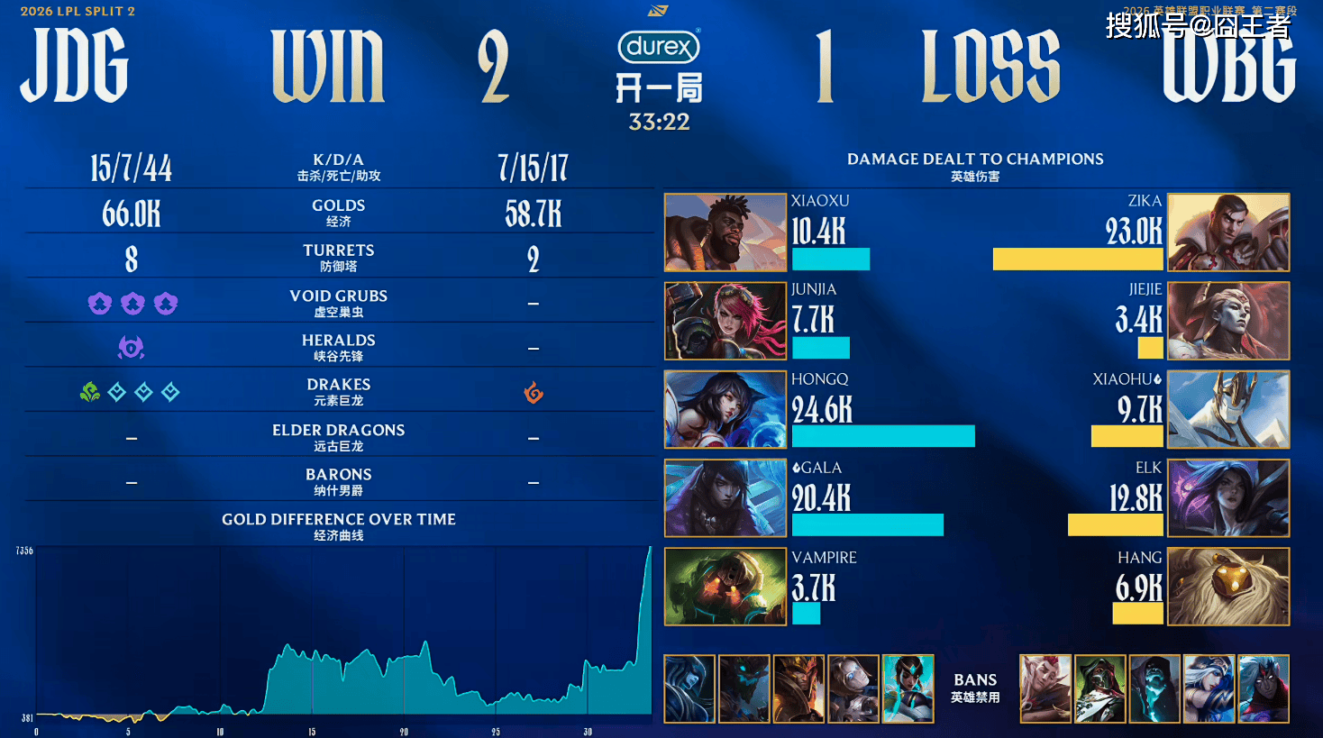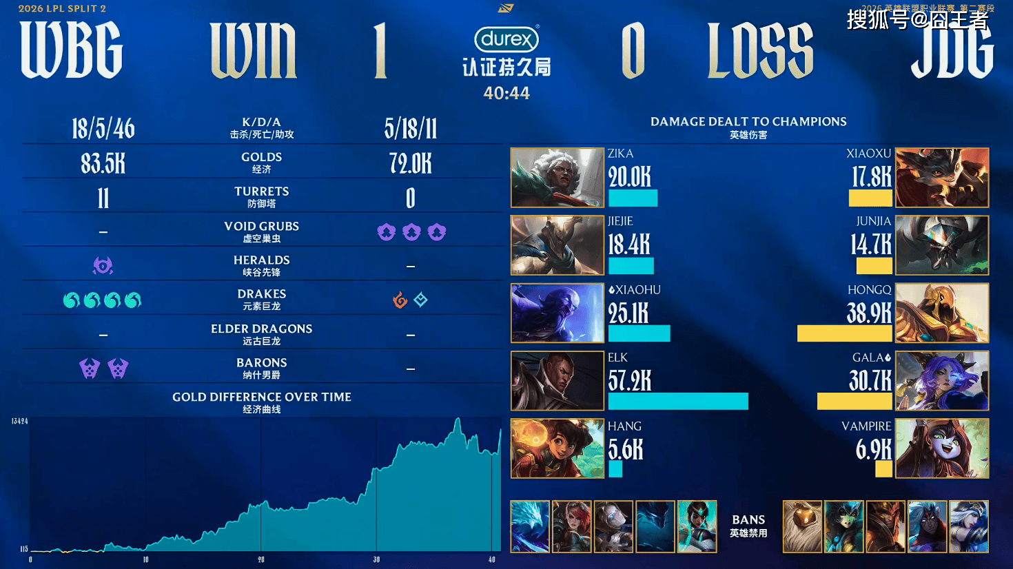 结果第一局比赛,近几场屡战屡败的JDG,依旧没有找回自己的状态,刚拿到首胜的WBG,乘胜追击,拿下比赛。6分钟:WBG野辅双双支援下路闪现击杀GALA芸阿娜拿下一血;9分钟:潘森开大gank上路配合队友拿下兰博人头;14分钟:WBG中野联动击杀沙皇;16分钟:WBG中野联动连续抓死HongQ沙皇扩大优势;22分钟:Junjia蝎子抓到站位过前的Elk卢锡安闪现大招拿下人头;34分钟:Elk卢锡安伤害爆表,Junjia再次阵亡WBG拿下龙魂大龙;37分钟:GALA芸阿娜终结小虎后接连击杀Elk卢锡安拿到两千终结赏金;最终40分44秒:GALA守家被秒WBG一波结束比赛