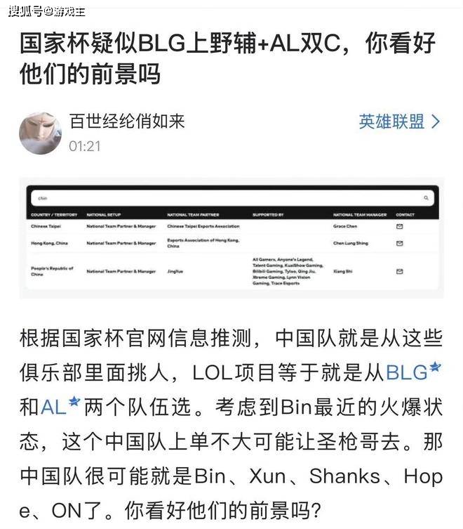 此前,根据消息的透露电竞国家杯有一项规定,一支战队最多只能有三名选手参赛,很有可能会是上单bin,打野xun,中单香克斯,AD hope和辅助on。说实话,这套阵容真的差的离谱,尤其是AD位置,Lpl赛区的国产AD至少有三个都要比hope更适合,比如JKL,ELK,Gala,甚至说,目前状态非常稳定的Assum都感觉比他更强。就看后面的战队官宣了,如果还有lpl赛区,其他的队伍入选的话,阵容应该还会有所调整,如果真的只是这两个队的话,估计就是这样的首发了。