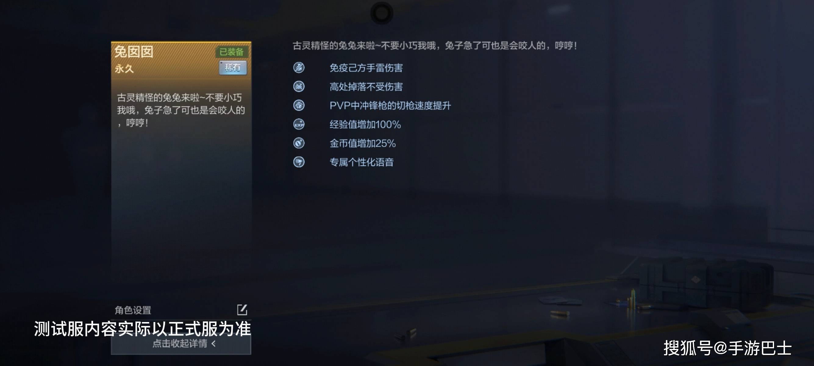 兔囡囡的角色技能非常适合冲锋枪玩家的作战需求。她可以在PVP模式中提升冲锋枪的切枪速度,让冲锋手在近距离交火中更快切换主副武器,减少切枪间隙被击杀的风险。同时还有专属个性化语音,让古灵精怪的兔兔形象更加鲜活。除此之外,兔囡囡不仅能够高处掉落不受伤害,还能免疫己方手雷伤害。