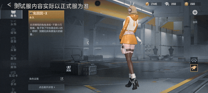 兔囡囡通过角色觉醒石觉醒之后,变成兔囡囡-X,不仅可以通过洗炼拥有额外的角色能力,同时在角色界面中也增加动作展示。动作展示过程中,兔囡囡-X蹦跳转身后,低头弯腰向你打招呼,叉腰起来,非常有甜妹的感觉!