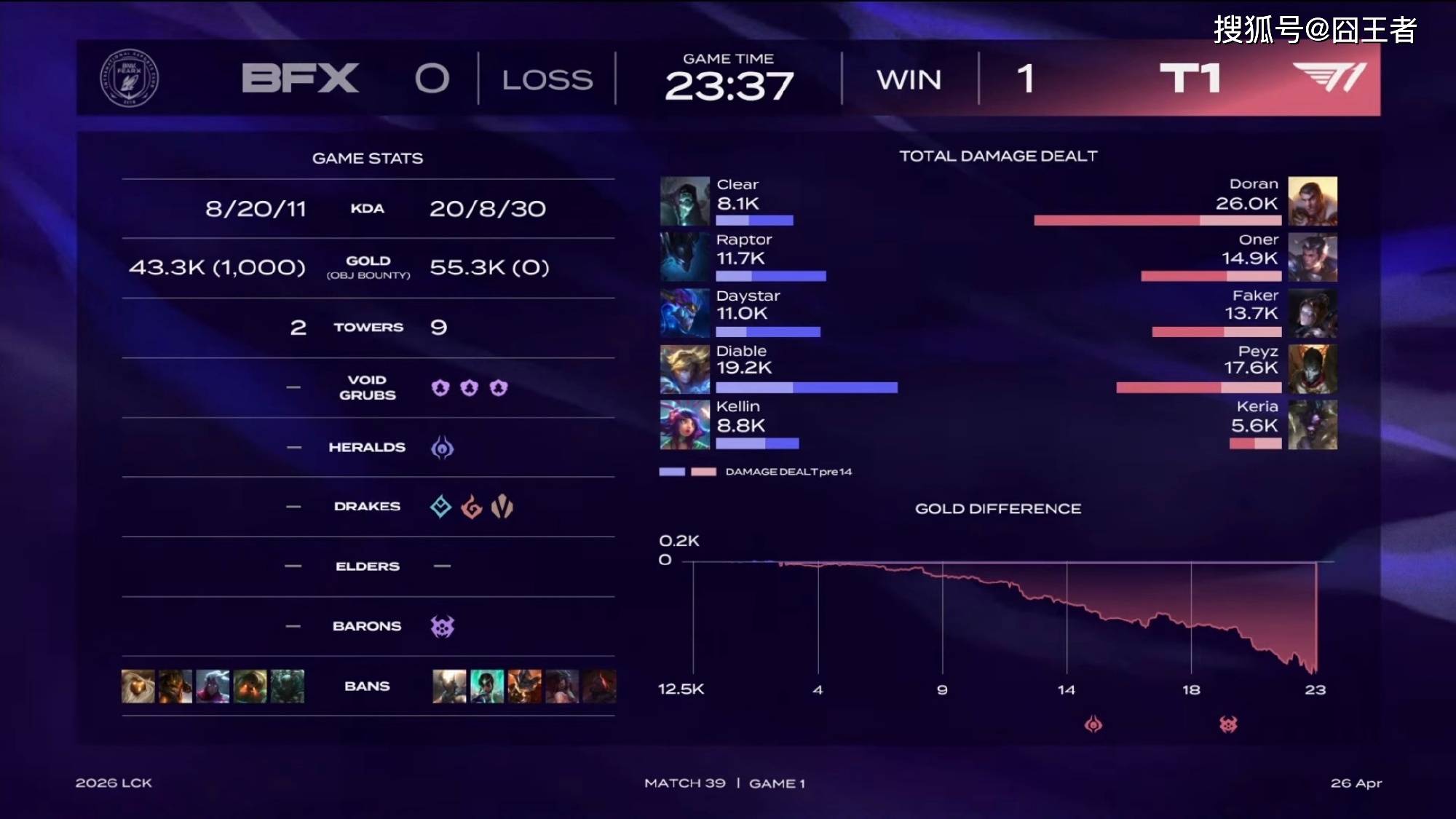 第一局比赛,BFX蓝色方,禁用:巴德、皇子、韦鲁斯、泰坦、派克,选用:Clear掘墓、Raptor梦魇、Daystar龙王、Diable伊泽瑞尔、Kellin妮蔻;T1红色方,禁用:潘森、卡尔玛、兰博、阿卡丽、塞恩,选用:Doran杰斯、Oner赵信、Faker发条、Peyz烬、Keria牛头