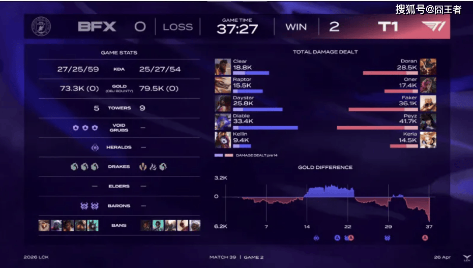 结果第二局比赛,两队从头打到尾,T1凭借经验优势,笑到了最后。比赛前期,BFX上中多次对位单杀帮助BFX一度打出优势;比赛第18分钟,两队在中路爆发团战,Raptor纳亚菲利三杀帮助BFX打出2换4大胜;比赛第21分钟,BFX先后打出3换5团灭T1,随后BFX拿下大龙;比赛第23分钟,T1野区反击打出2换5团灭BFX,打掉对手大龙Buff;比赛第30分钟,BFX打出1换3秒掉Peyz女警后拿下大龙;最终比赛第37分27秒,BFX强开女警但只打掉复活甲,T1反击打出1换5团灭BFX后结束比赛。