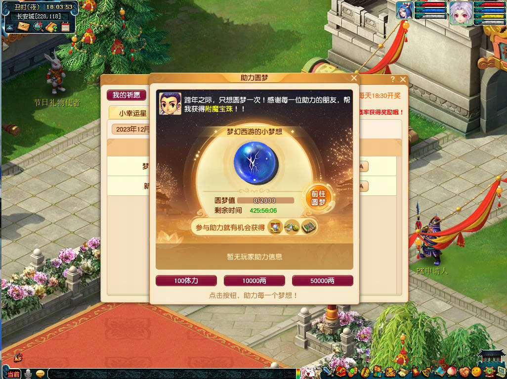 每日18:30,元旦小仙将挑选部分幸运少侠,包括超幸运少侠和小幸运少侠。超幸运少侠将有机会直接领取圆梦图中的奖励!而小幸运玩家也有机会邀请好友为自己助力,从而获得圆梦图中的丰厚奖励。