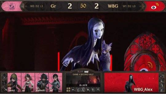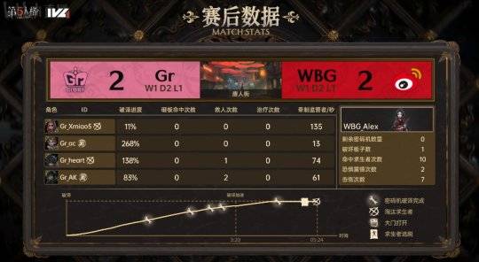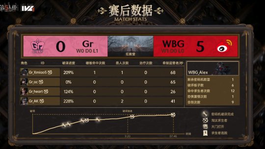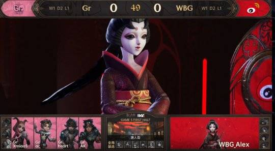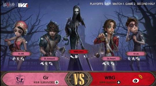 Gr的求生者选择了祭司、飞行家、前锋、杂技演员(BAN歌剧演员、蜘蛛、蜡像师);WBG的监管者Alex选择了红蝶。(BAN先知、拉拉队员、古董商、律师)