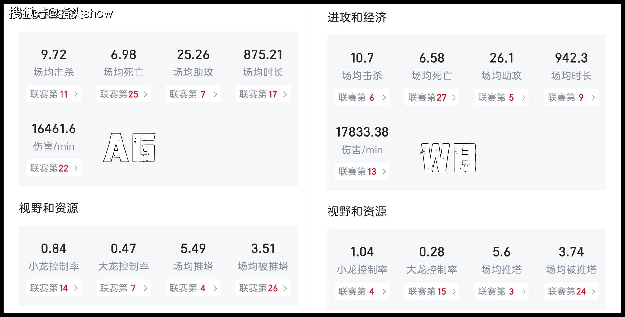 场均击杀低于WB,打场均死亡却高于WB,因此在进攻打架这方面,AG比较容易吃亏,而WB这一点做的相对更好一点,但 A G场均时长比较短,也不知道是好事还是坏事,因为闪电战不是他们打出来,就是对手打出来的。