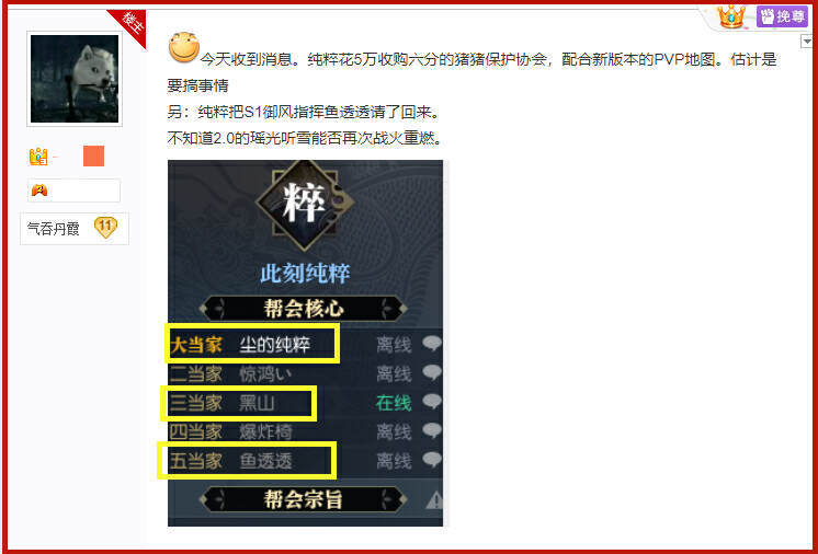 这位神豪正式回归之后,不仅迅速花5万块买下了“猪猪保护协会”改名为“此刻纯粹”,而且还直接请来了七冠王江畔寻花的分团长黑山,以及在S1赛季时,表现非常出色的御风指挥鱼透透。