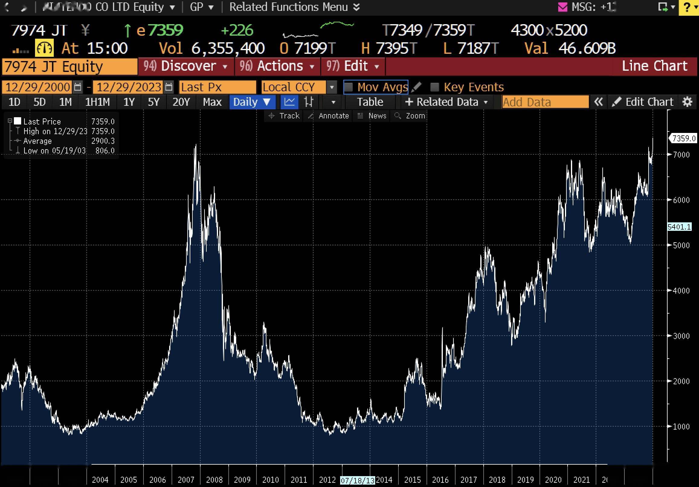 凭借辉煌的2023 任天堂股价在年底创下历史新高