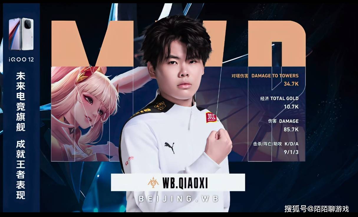 0-2落后,再到2比2,WB又一次做到了让二追二!第四局,乔兮的公孙离打出了9-1-3的数据。如果WB能够获得总决赛的冠军,那么乔兮拿FMVP的可能性也非常高!或许公孙离要等的人不是一诺,而是乔兮!