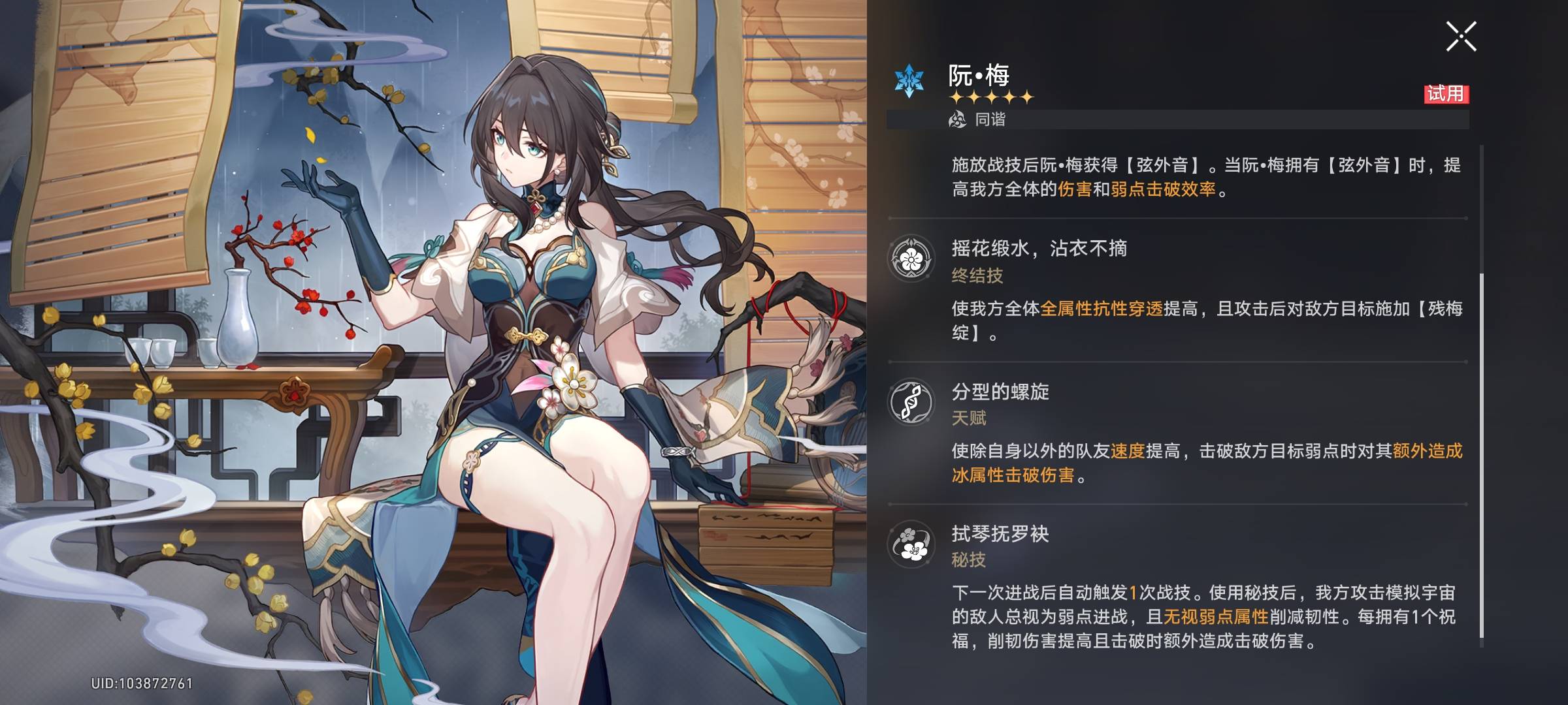 大家好,我是boyue,本篇来说下1.6版本的新角色阮梅,一位超强力辅助选手(高贵的5星同谐),镜流的最佳拍档,有了她,感觉游戏基因都变了(笑)。