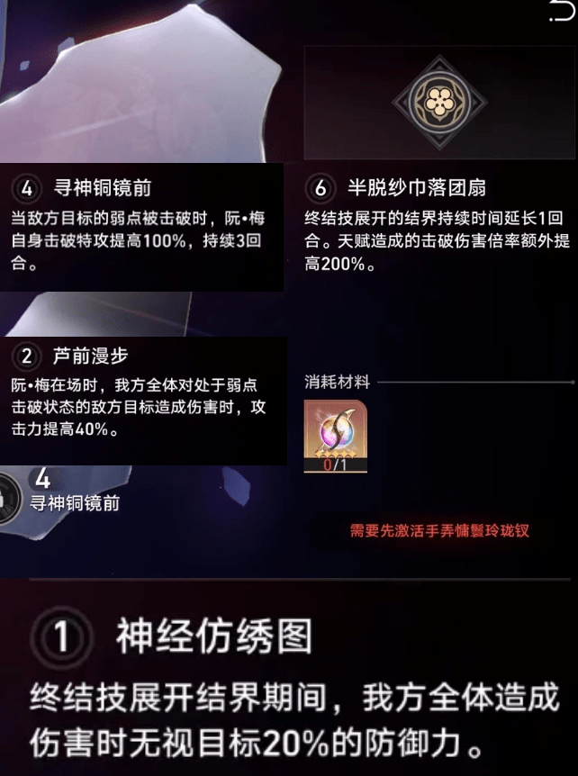这边需要注意,阮梅非战斗时的击破特攻面板属性堆到160%即可吃满技能了(有天赋在战斗中全队加20%),后续则优先堆速度,于是遗器套装的选择就有了。