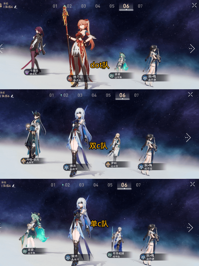 队伍搭配1:阮梅+卡芙卡+藿藿+dot手。