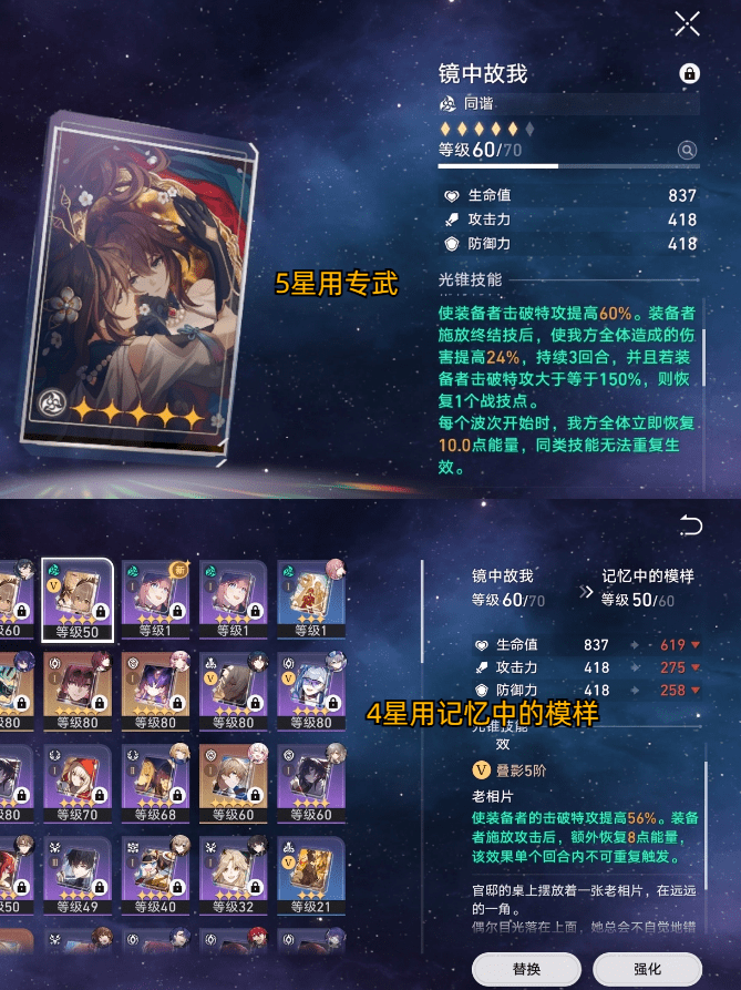 星魂:看到星魂6直接流口水,这名字(划掉)效果真是太棒了,然后4,2,1也都很好,1的性价高,和专武比的话就看有没藿藿,有藿藿专武更重要,没藿藿星魂1更重要,这时光锥就用记忆中的模样补充能了。