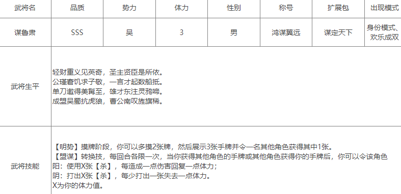 与鲁肃本人的远见相比,谋鲁肃的设计强度明显是不在线的,【明势】单技能的效果是削弱版的【英姿】,主要作用还是队内通牌,没组织的对局用处不大,主要作用还是联动【盟谋】,【盟谋】这个技能文案写的不行我直接写实战啥效果:作用对象是拿了你的牌的“他”或你获得了他的牌的“他”;阳状态对象队友,他能出X张【杀】,杀中回血,阴状态对象敌人,敌人,他要“扔”X张【杀】,没扔扣体力(类似于单人【南蛮入侵】);【杀】可以不是“真杀”。