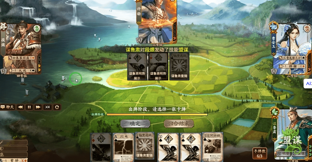 谋鲁肃是3血3技能吴将,【明势】摸牌阶段,你可以多摸2张牌,然后展示3张手牌并令一名其他角色获得其中1张。【盟谋】转换技,每回合各限一次,当你获得其他角色的手牌或其他角色获得你的手牌后,你可以令该角色阳:使用X张【杀】,每造成一点伤害回复一点体力;阴:打出X张【杀】,每少打出一张失去一点体力。X为你的体力值。