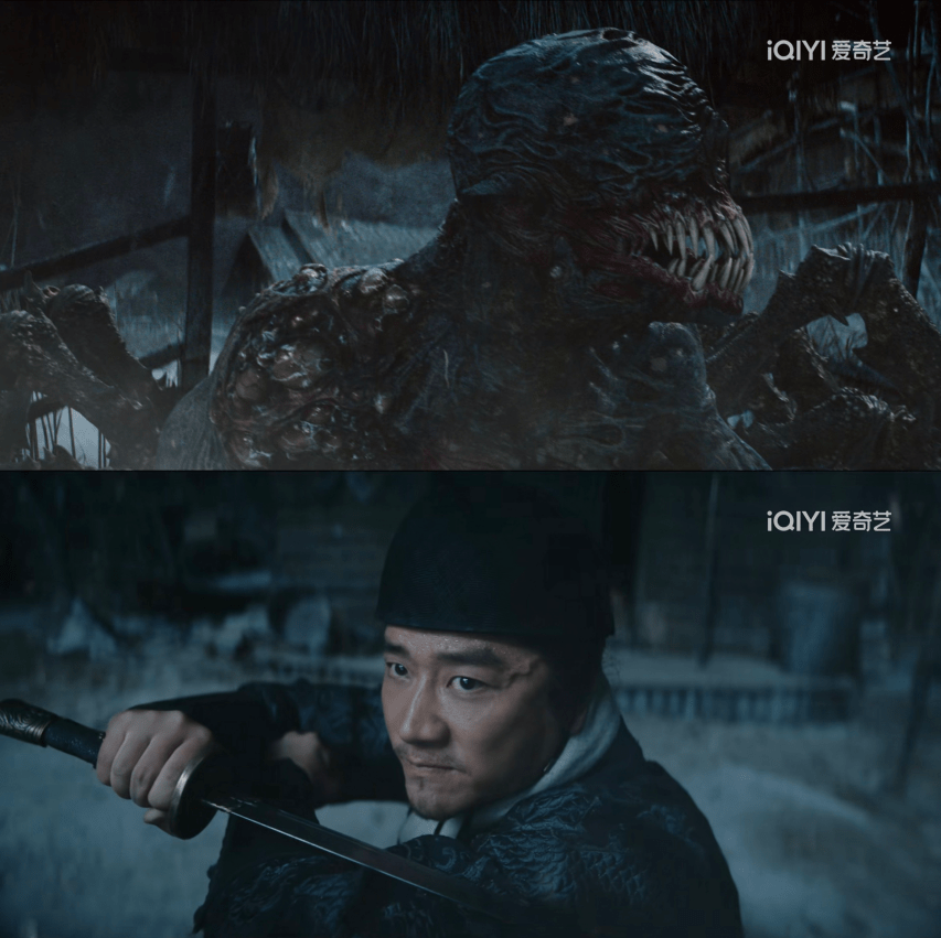 怪物直接从屋子里出现,移动之迅速,褚思镜和伯颜两人无法匹及。本还在身前的怪物瞬间移动动到身后,借助体型直接压制。但褚思镜也没有退缩,以刀护身。看到褚思镜脸上的青筋,不禁想要提醒大家,此刻可以呼吸。虽两人四手打不过怪兽,但暗中有人帮助,褚思镜和伯颜还是暂时逃过了一劫。