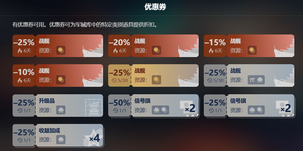 友情提示:如果你最近想从军械库买船,那一定要先点击右上角的“优惠券”,官方这次可是给我们准备了足足4张,可减价10%至25%。即使近期没有购船的计划,如此高的折扣力度仍然值得考虑,特别是那张25%的券,不用掉实在是过于可惜。