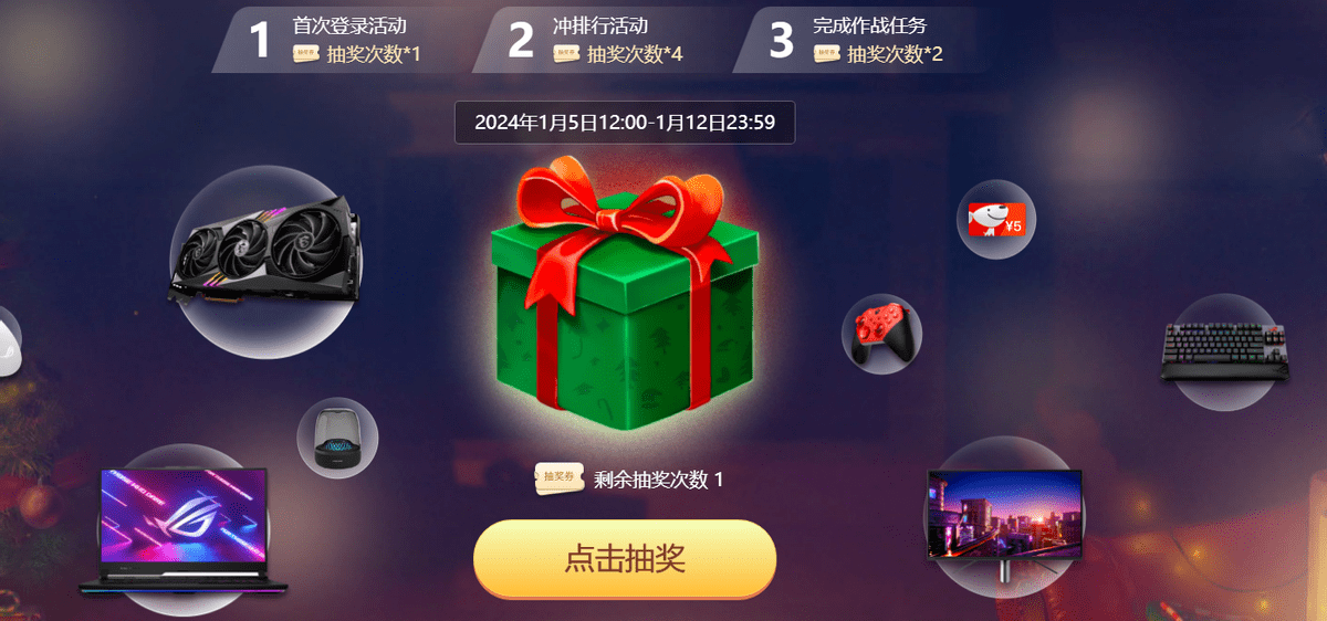 前两天的”巅峰竞技“活动大家都参加了吧?各个舰长排行榜靠前的大佬可是拿到了顶配主机、4080显卡、电竞显示器等实物大奖,真是羡煞我等。没有拿到这些奖励的朋友也不用担心,1月5号之后就可以参加抽奖了,大部分舰长估计都积攒了7次抽奖机会了吧?没准就一发入魂了。