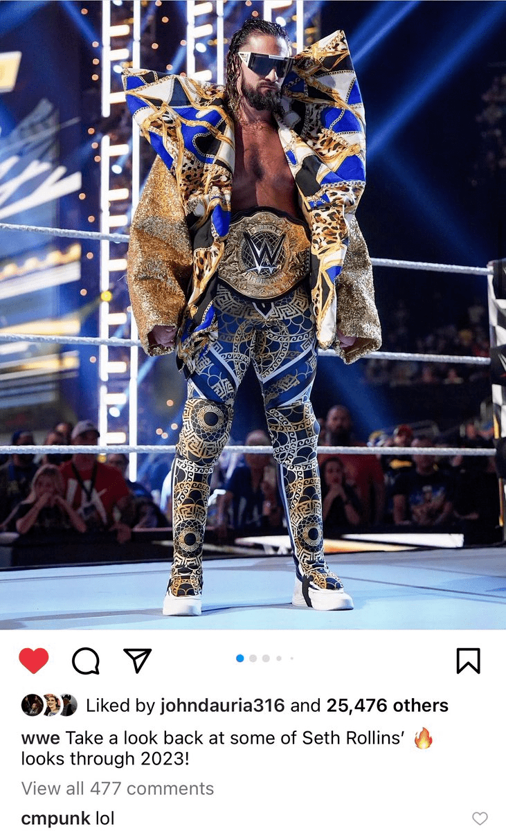 今日正好就是2023年最后一天,一位赛斯·罗林斯的粉丝在社交媒体上更新了一张赛斯·罗林斯的舞台照!并且在配文上写着“回首赛斯·罗林斯2023年职业辉煌瞬间!”(如下图所示)