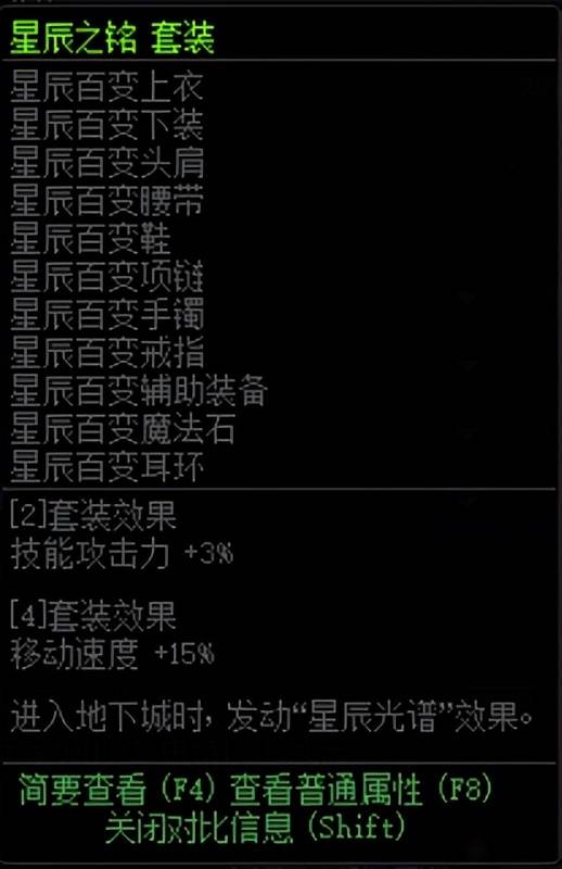 收集齐2、4件星辰百变装备,可以分别出发技能攻击力+3%、移动速度+15%且可以触发星辰光谱效果,大百变怪、小百变怪和假百变怪都可以用来触发套装效果,所以集齐四件星辰百变触发套装效果也是当前版本的毕业目标之一。