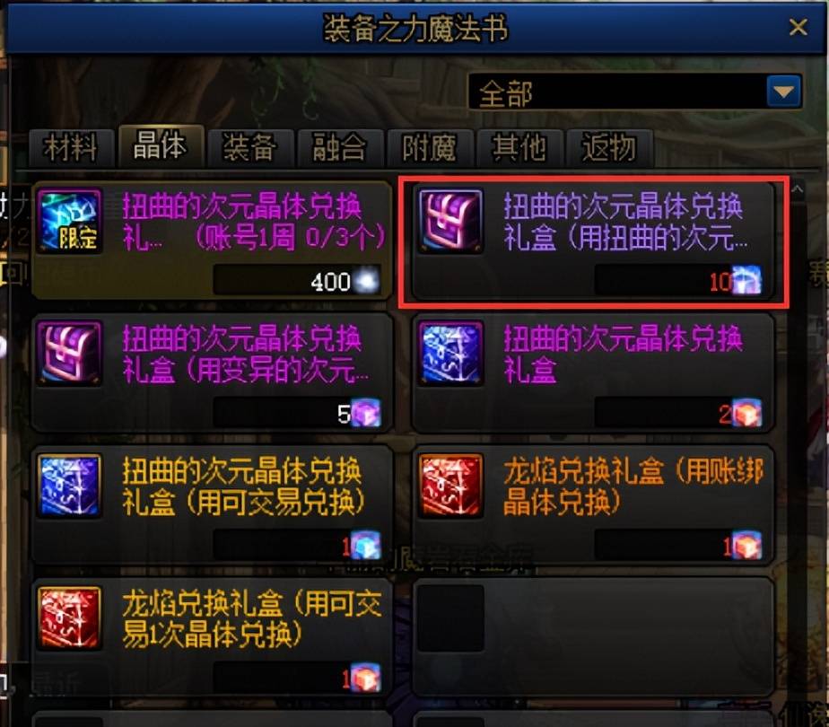 当图鉴当中添加了五条相同的属性时,可以消耗5个属性转换成一个扭曲的次元气息礼袋,10个扭曲的次元气息可以在装备之力魔法书商店当中兑换一个扭曲的次元晶体。