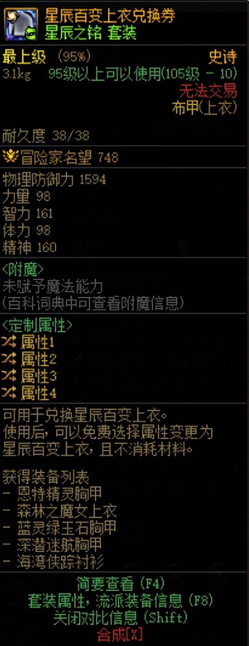 3.假百变怪获取方式:分解小百变可以获得星辰百变装备部件,在泰希缇处可以将一件特定的定制属性史诗升级成朦胧星辰装备;作用:凑齐星辰百变装备图鉴,但是不可以通过定制属性图鉴任意转换词条。