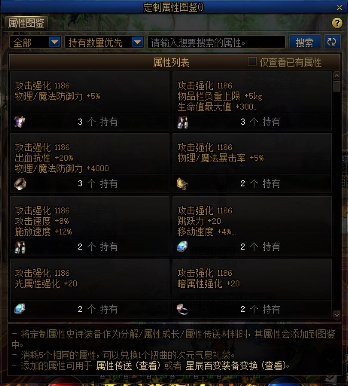 通过分解定制属性史诗或者定制属性史诗被喂养,可以将这件装备上面的四个词条全部收纳到定制属性图鉴当中,后续使用属性传送功能或者更换百变怪词条的时候,可以直接选择定制属性图鉴当中的词条。