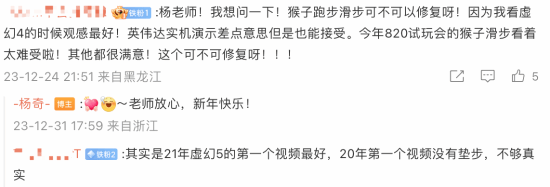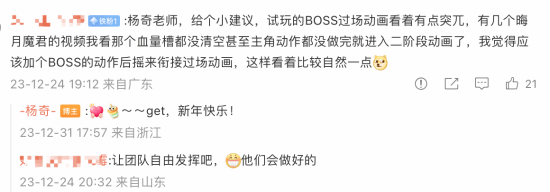 在制作人杨奇的一条日常微博下,就有玩家发“小作文”,针对游戏的部分过场动画以及820线下试玩中出现的角色滑步问题提出了修改意见。针对这些提议,杨奇也都一一回复,表示“收到”“老师放心”,还不忘加上“新年快乐”。