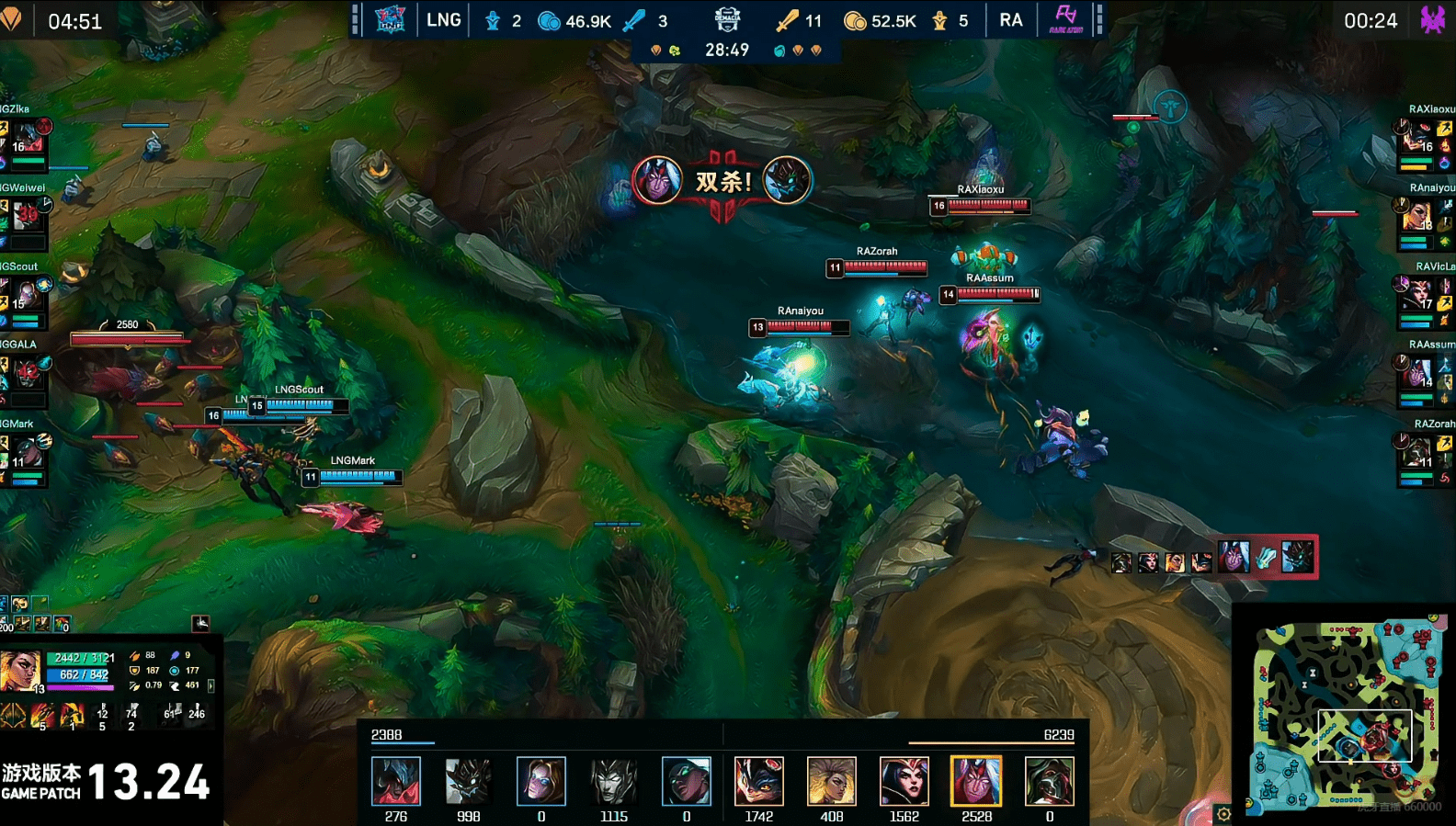 两队前期并没有过多的交战,就下路的一波越塔打出1换1。LNG与RA的打野都在中下一直寻找机会,最终还是Weiwei的Gank将RA的中路小炮击杀,让LNG在前期人头领先RA。