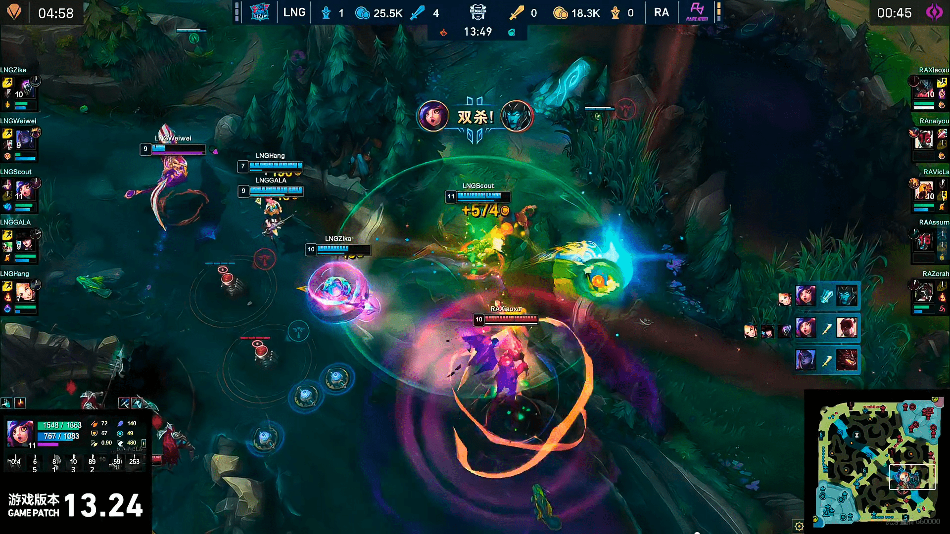 中期两队都在寻找机会,并没有发生太大的激烈交火。比赛22分钟在中路,LNG在中路打出3换5,RA这波惨遭团灭,前期领先的被LNG逼平。