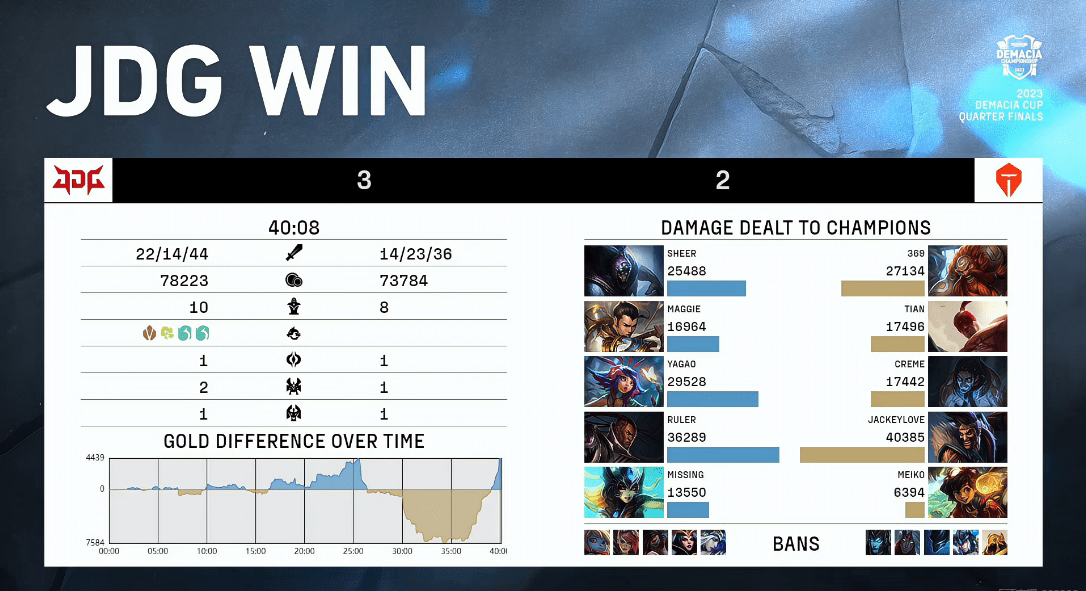 TES翻了4400却被JDG逆转了7500经济差,双方这场40分钟的比赛跌宕起伏,一波三折。但即使有重伤,水龙魂还是在团战中给予了JDG制胜的帮助。JDG晋级四强,他们的对手是今年有点青春风暴味道的RA,值得期待。