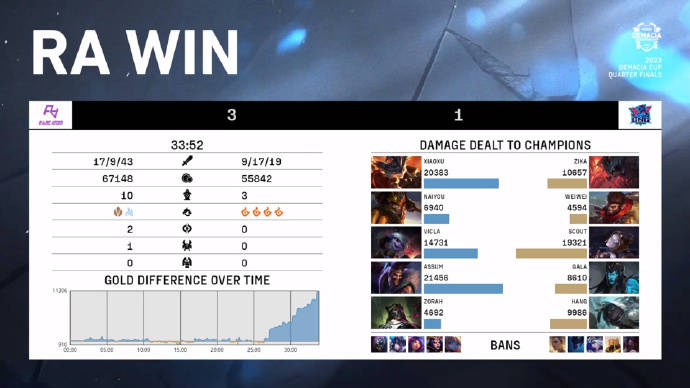 没想到关键时刻Scout中路给到对手机会,被RA一波打了回来,RA掌控势头之后,德莱文上路直接斩杀GALA,GALA来了一波闪现迁坟操作,后续RA来了一波精彩的41拉扯,正面击溃LNG,最终顺利拿下比赛晋级四强。