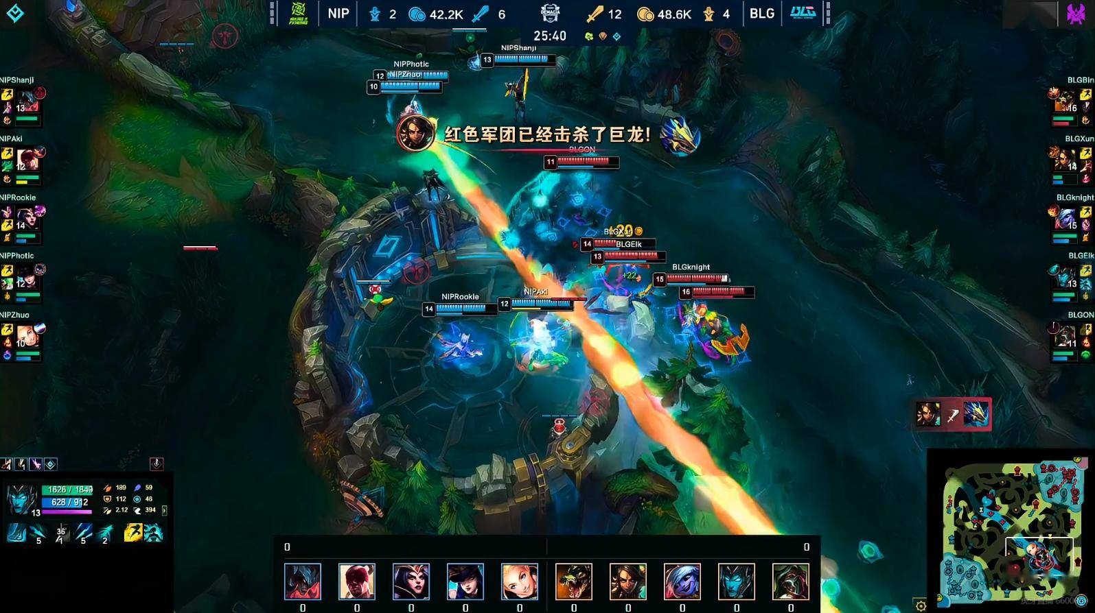 比赛中期BLG转线多次抓死NIP的妖姬,断了Rookie妖姬的节奏。中期的二先锋与小龙也被BLG全都控下,BLG在中期的资源控制与团战上都是将NIP碾压摩擦。