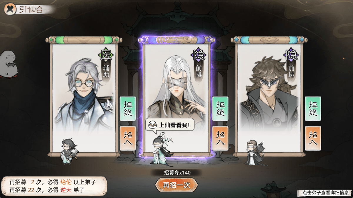 这款游戏最令人着迷的莫过于那“千人千面——弟子随机生成系统”。在游戏中,玩家招募的每一位弟子都有着自己独特的外貌、属性和性格特征,他们可能来自不同种族,家族,派系等等,都是寻常的。身为祖师的我们,要做的就是根据弟子的特长和秉性,为之安排不同的生产经营工作,或战斗历练,也可以给他们传授我们的武功秘籍,修仙感悟,还可以遣派他们前往三千世界游历冒险,探寻秘境,广结道友。