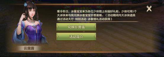 寒冬时节,冰蚕宝宝前来为各位少侠送上祝福好礼,1月4日至10日活动期间只要完成活动任务即可获得奖励,还可额外获得大冰块,收集即可兑换珍稀冰蚕宝宝珍兽蛋!