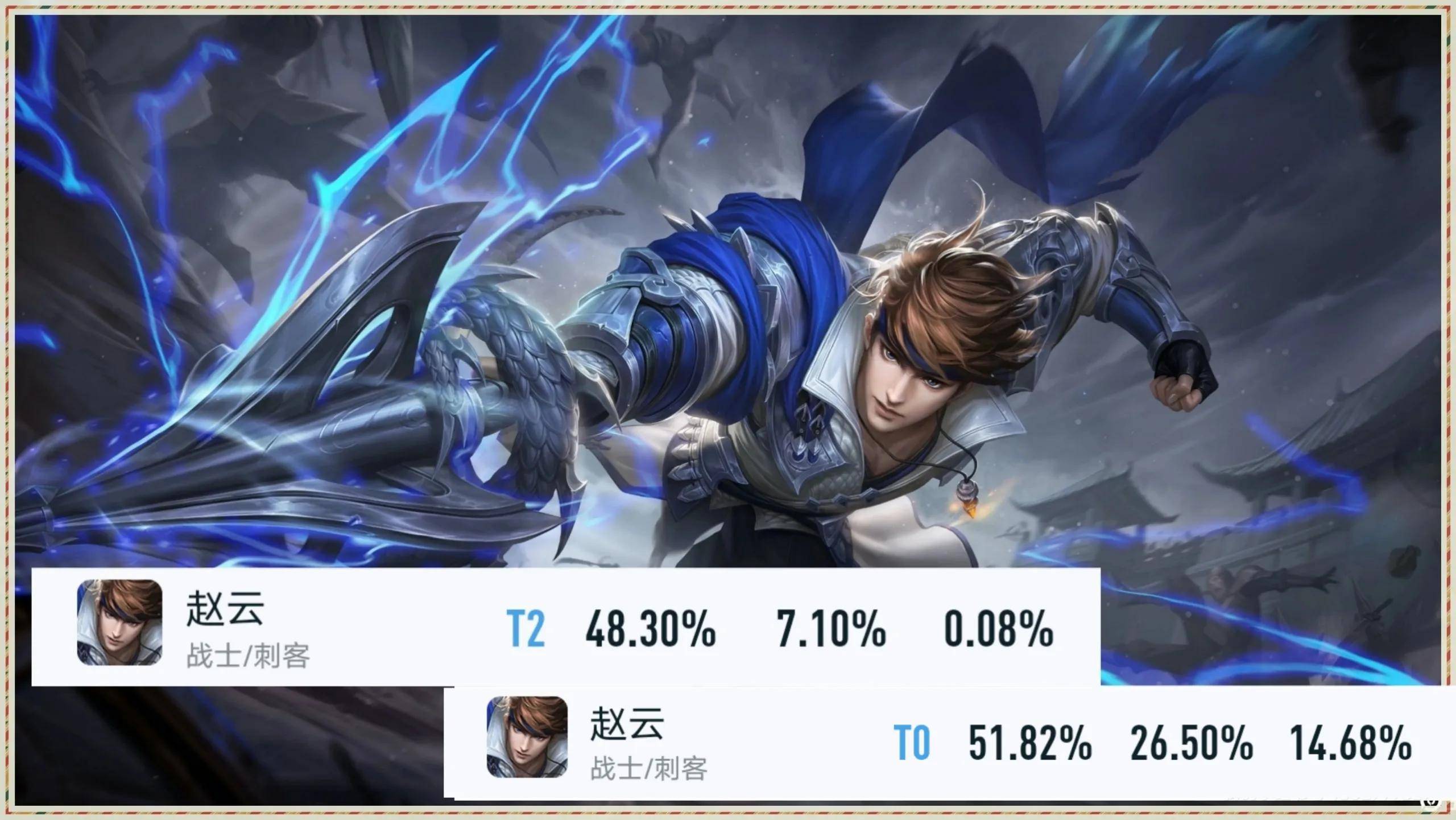 咱们不妨来看一组数据,上边的数据是上个赛季赵云的表现,而下边的数据是赛季更新两天后赵云的表现。