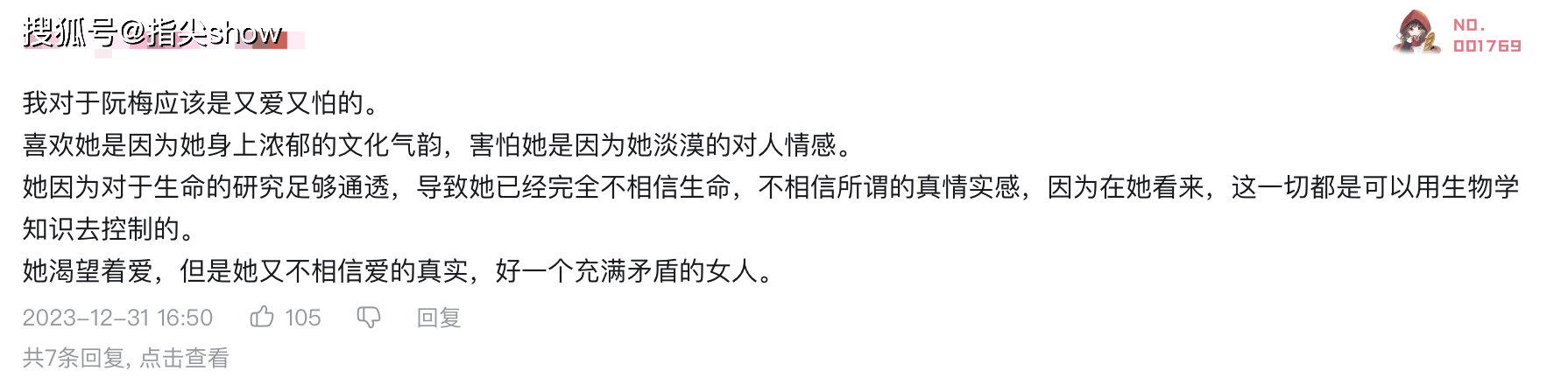 有玩家在理解阮·梅暗藏的数十首诗词后,觉得这个角色有点可怕,这也源于阮·梅本身展现出来的淡漠。不过正是这样矛盾的特质融合在一起,阮·梅展现出来的也是独有的魅力,因此获得了大多数玩家的喜爱。