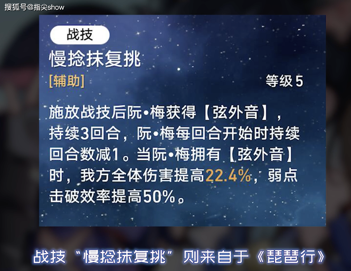 其他诸如阮·梅的技能、星魂,每个取名背后都能追根溯源找到相对应的诗词,而且也全都是与阮·梅的人设相关,看了只觉得这个角色确实如外表所体现的那样,是个诗情画意的角色,也感叹星穹铁道在角色塑造上的出色。