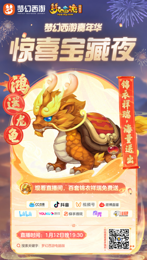 欢庆佳节,豪礼送不停!《梦幻西游》倾情打造的“惊喜宝藏夜”直播盛宴即将于1月12日晚19:30盛大开启。此次盛宴不仅有青花瓷锦衣的免费抽取,更有福利雨、超级神龙以及高级兽决等丰厚奖励等待少侠们领取。规模之大,前所未有,各位少侠可不要错过啦。