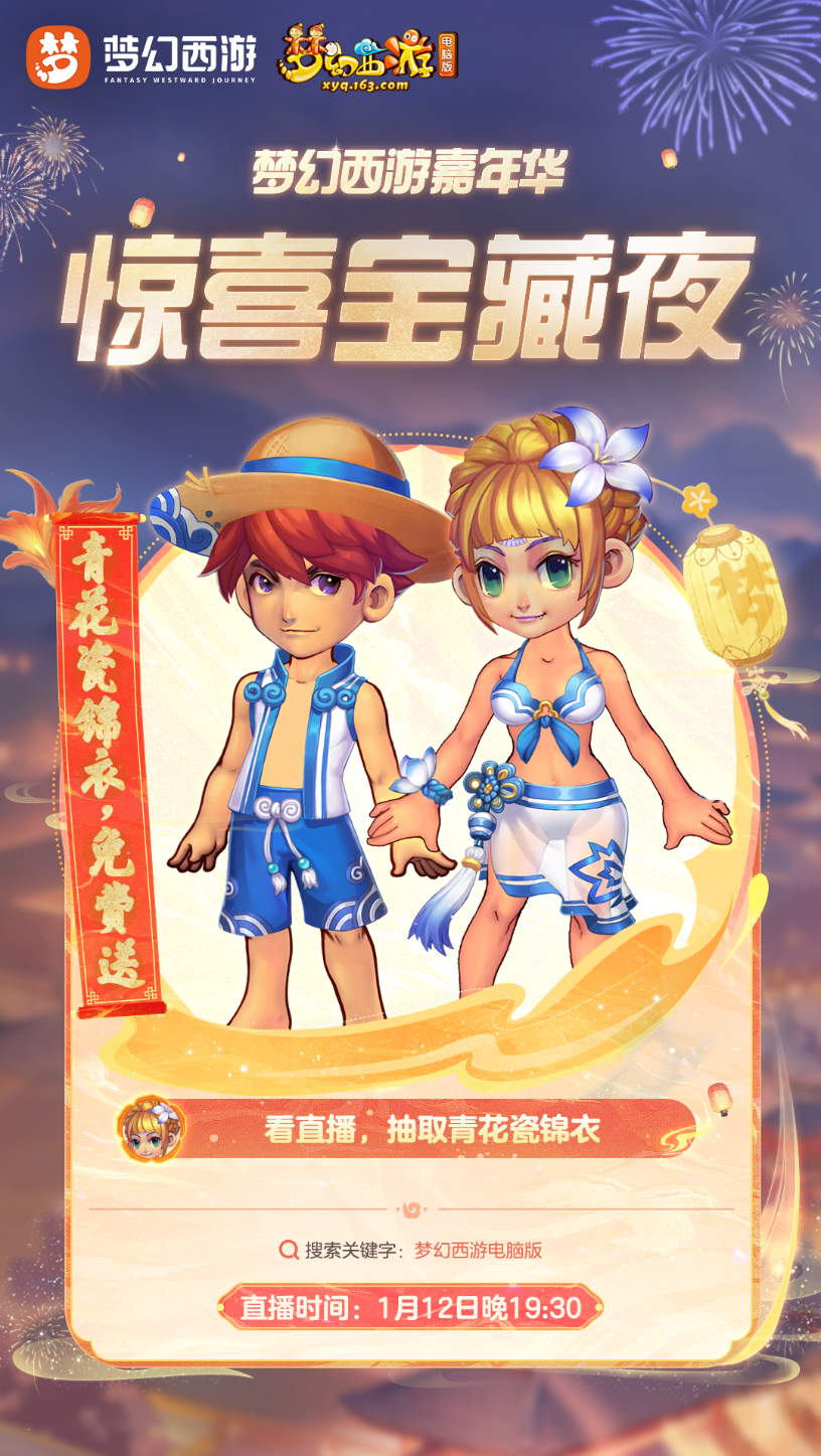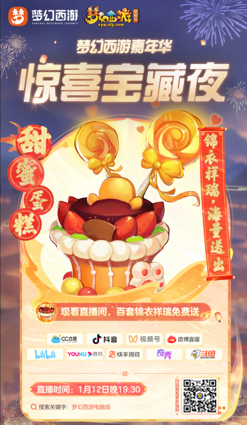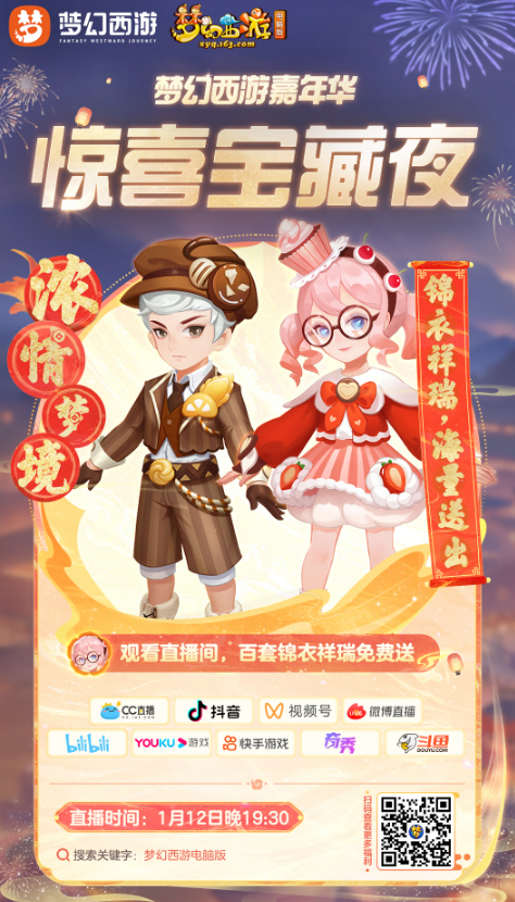 以上就是“惊喜宝藏夜”为各位少侠准备的多重惊喜豪礼!别再犹豫了,赶快邀请您的梦幻好友一同锁定1月12日晚19:30的“惊喜宝藏夜”直播活动吧,共同探索无尽的惊喜与宝藏。
