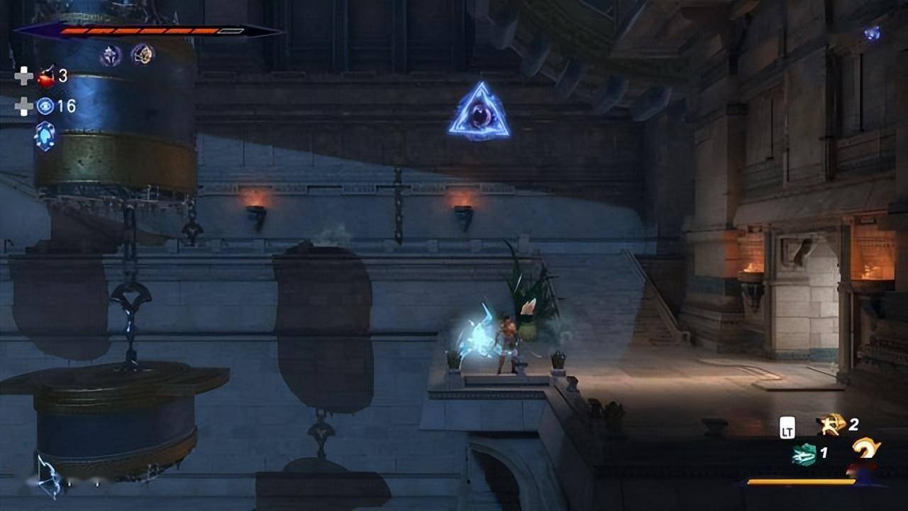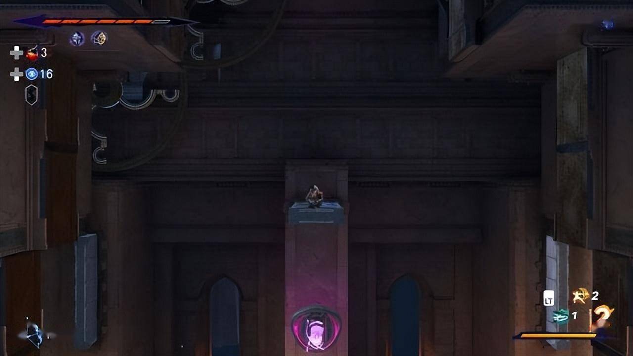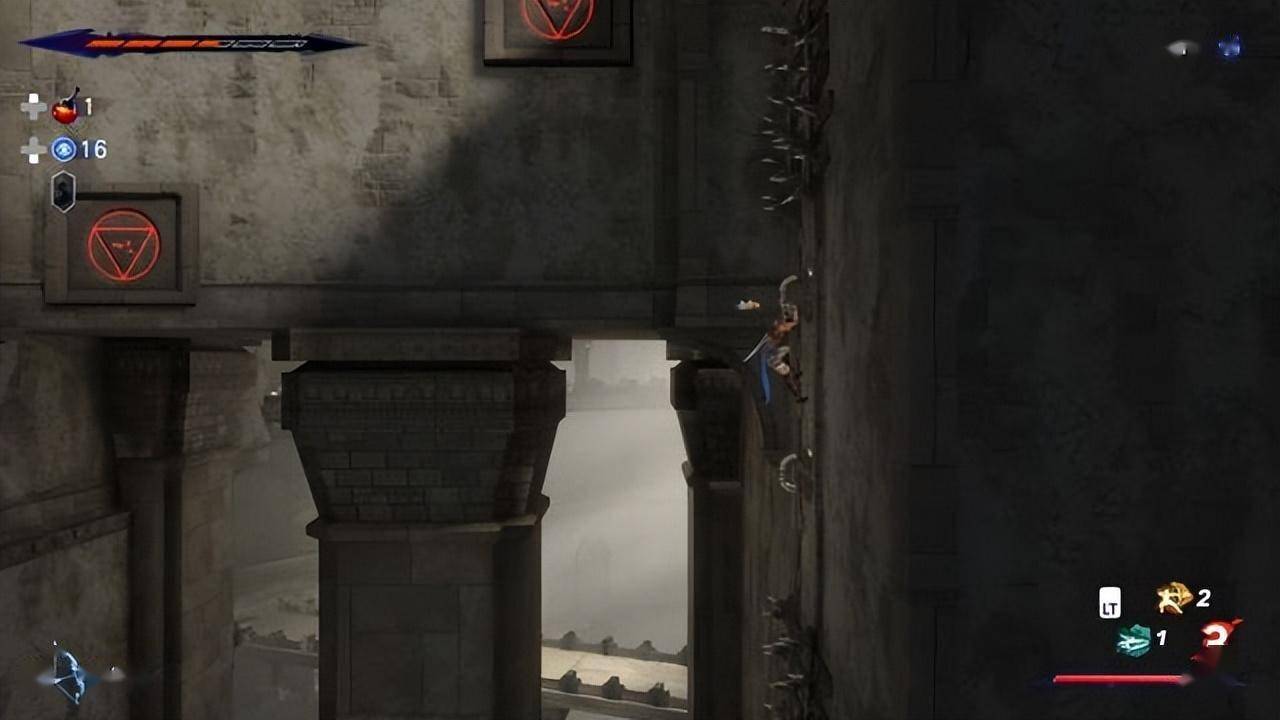 然后古币、铸铁、护符栏位和血量碎片这些对于战斗力提升最为直观的物品,也成为了本作地图探索中最有价值的战利品!然而想要获得这些战利品,往往需要通过比主线困难的多的跳跳乐!然后跳跳乐的困难在于——我们拥有二段跳、钩爪、切换时空、抓取和投掷物体、射箭、瞬移到旋刃处*,但是需要把这一切连续的在空中完成!很容易猪脑过载,或者我脑子会了,但是手不会。