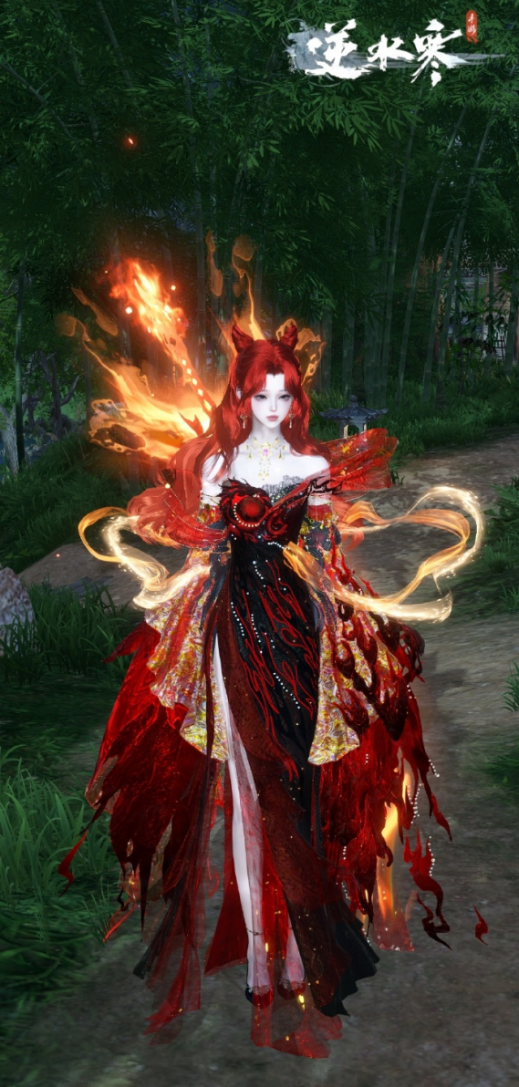 红染后的东君时装完美诠释了什么叫凤凰涅槃,暗红色染色搭配红发,瞬间给人一种顶级高奢时装既视感,《逆水寒》手游玩家是懂染色的,144元的时装能染出如此惊艳的效果,真不愧是销冠。