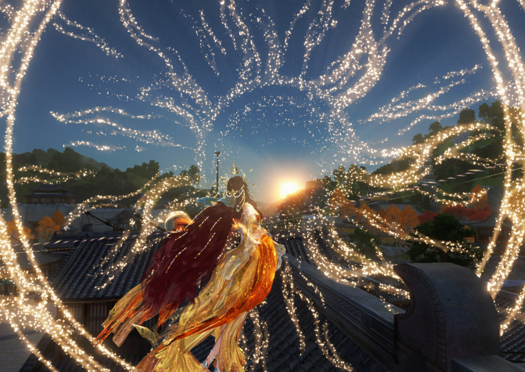 东君时装不仅质感设计得很出色,在细节方面也很用心,时装自带的动作特效真的很惊艳。当玩家施展动作后周身会散发出太阳光环,真的如太阳神一般耀眼,穿上这套时装可以直接化身为太阳神向万物赐福。
