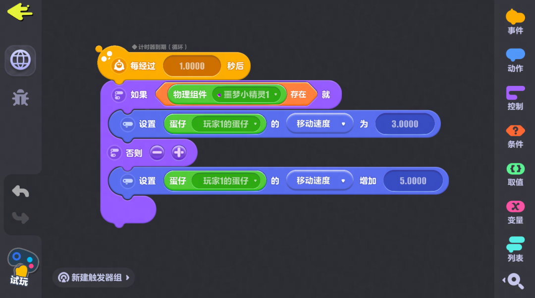 对于UGC创作而言,用户创作上限除了与工具的功能强关联,很大程度上离不开官方对创作权利的“下放”。实际上,早在去年,蛋仔UGC就通过推出“蛋码”功能,将「动作」和「条件」语句像「拼积木」一样拼接,把创作者的逻辑创意高效、直接地转化成专业的UGC内容。