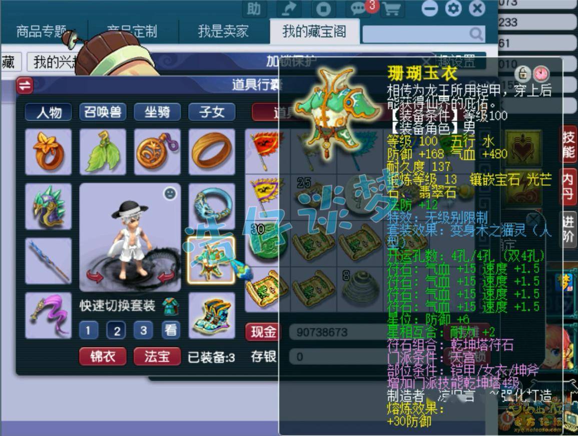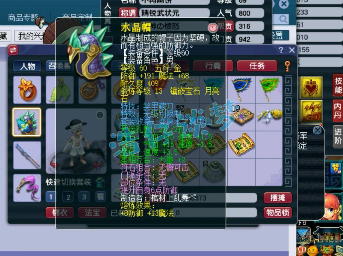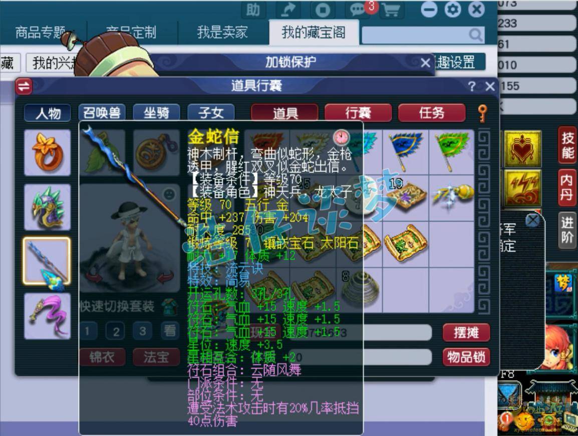 号是69级的天宫,这是他用来刷任务的力属性,PK中还是以封系为主,直接看他的装备吧!