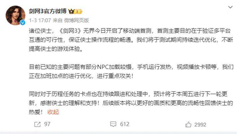 这厢玩家闹得不亦乐乎,那厢西山居也没闲着。为了确保大多数人都能顺利玩上剑网3无界并拥有最好的游戏体验,西山居不仅24小时紧盯微博、贴吧等社区收集玩家意见,还安排了众多紧急支援对游戏火速优化,突出一个全天候待命。作为首轮技术测试,西山居的直面问题的态度值得肯定,有问题就改,给玩家带来更好的游戏体验,以此形成良性循环。