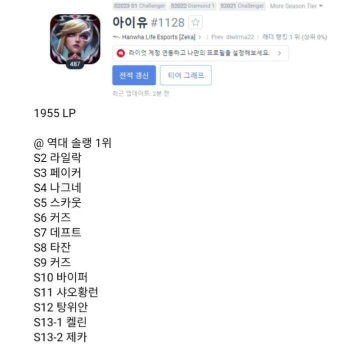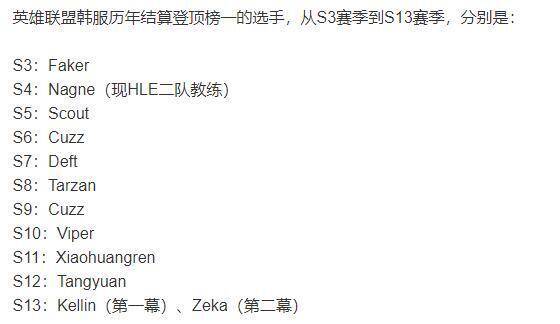 我们来看看这个榜单,登上韩服第一的顺序分别是S3:Faker、S4:Nagne(现HLE二队教练)、S5:Scout、S6:Cuzz、S7:Deft、S8:Tarzan、S9:Cuzz、S10:Viper、S11:Xiaohuangren、S12:Tangyuan、S13:Kellin(第一幕)、Zeka(第二幕)。